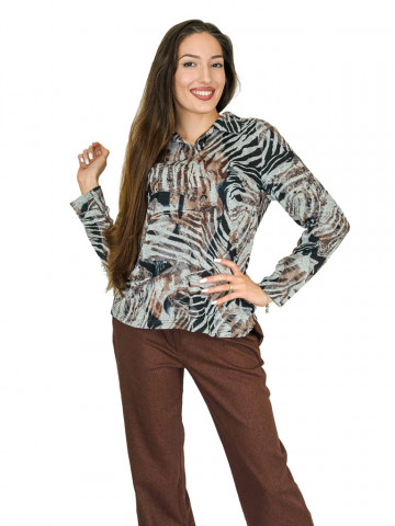 Long sleeve women's blouse, made of soft hosiery material. The blouse has an animal print in brown, gray and black which is not too eye-catching. Perfect for fall, winter or spring.Made in Bulgaria by Franziska.Material: 96% polyester, 4% elastane..